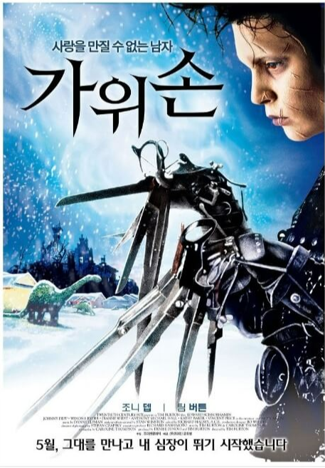 어린 시절 영화 가위손을 관람했을 때는 막연히 선과 악이 구분 되고 판타지적인 요소 때문에 그냥 재밌있는 영화로 기억했지만 성인이 되고 난 후 다시 관람해 보니 영화에 나오는 모든 등장인물들에게서 현실을 살아가는 사람들이 겹쳐 보였고 표정 연기가 전혀 없는 에드워드역의 조니 뎁에게 깊은 감정을 느끼며 공감하게 되었습니다. 분명 영화 전체의 시나리오는 간단하고 가볍다고 생각하지만 그 안에 담겨진 요소요소가 제 마음을 깊게 파고들었던 명작입니다. 안에 담긴 요소라 함은 처음에는 애드워드의 모습이 굉장히 무섭지만 인간의 편견과 오만이 부른 비극을 다룬 작품으로 동화 속 같은 마을의 풍경과는 달리 그곳에 사는 사람들의 추한 본성이 묘하게 어울리는 영화로 제 기억에 남아 있습니다. 특히 너무나 착한 심성을 지닌 에드워드가 영화 속 현실에서 사람들과 어울려 살아가기에는 너무나 순수해 보여 감독 팀 버튼의 동화 같은 영화가 주는 메시지가 참 좋다고 생각했고 애드워드를 연기한 조니 뎁 특유의 연기력은 미친 것 같다고 표현하고 싶습니다. 또한 애드워드의 손이 가위라는 것이 불편할 수 있지만 자신만의 단점을 장점으로 승화시켰고 주변의 환경이나 분위기의 영향이 있으면 단점이 계속 생기겠지만 우리 주변에 에드워드 같은 특별한 사람이 있어야 한다는 것을 감독 팀 버튼이 우리들에게 전달하려는 메시지가 아닐까 생각합니다. 영화 가위손은 지금 봐도 영상미가 훌륭해 박수 받을 만하며 감독 팀 버튼의 초기 걸작으로써 그 누가 가위손 같은 캐릭터를 생각해 냈을까 고민하게 만드는 그의 반짝거리는 상상력이 가장 빛났던 작품이라 말하고 싶습니다. 특히 엉뚱하면서 생각하지 못한 장면들을 만들어내는 것으로 팀 버튼이 그 분야에서 최고가 아닐까 생각할 정도로 이런 감수성의 상상력은 그가 유일하게 가능하다고 판단합니다. 그래서 지금까지 팀 버튼의 영화 중 엄청 좋아하는 영화로 남아있어 크리스마스가 다가오면 눈이 날리는 장면 때문에 자주 챙겨보고 있습니다. 다만 한편으로 애드워드가 살았던 마을에 눈이 내리는 이유가 참 슬프고 아름답습니다. 가위손 애드워드라는 이름은 감독 팀 버튼이 존경하는 잊혀지다 돌아가신 B급 영화감독이라 하고 주인공 조니 뎁은 영화를 위해 기괴하게 메이크업만 하면 영화가 잘되는 신기한 마법에 걸린 듯 팀 버튼과 함께 작업한 작품들 모두 흥행에 성공하게 됩니다.