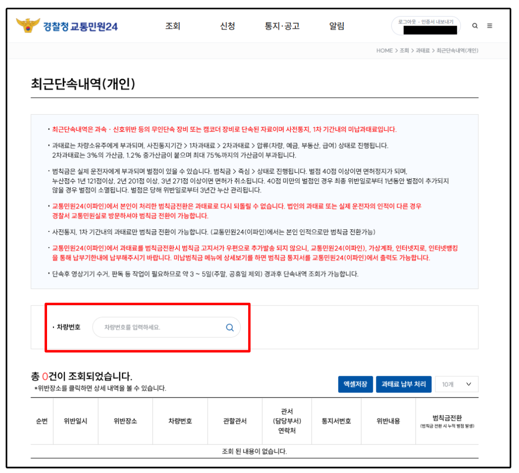 ● 차량번호 칸에 차량번호를 입력한 후 돋보기를 클릭하면 최근 단속 내역을 확인할 수 있습니다.
