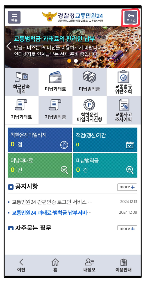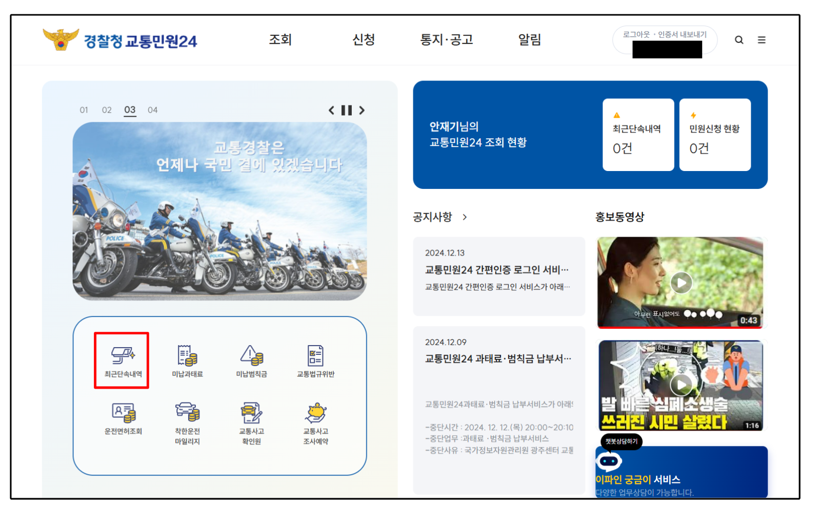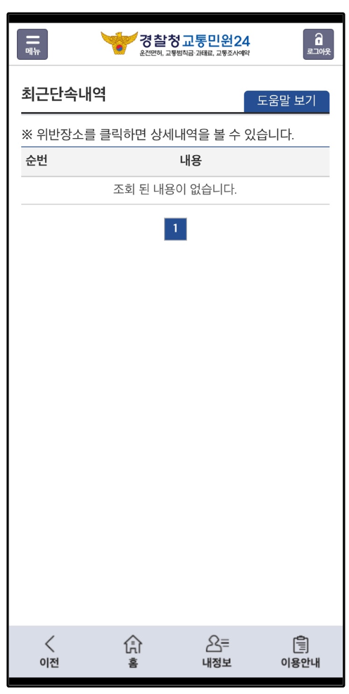 ● 로그인이 완료된 상태에서 최근단속내역을 클릭합니다.