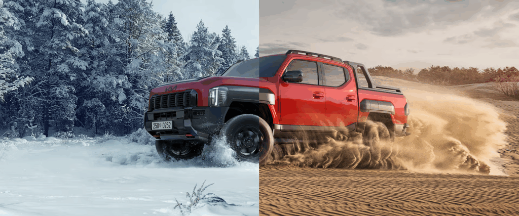 기아 타스만은 4륜 구동 시스템에 로우 기어와 디퍼런셜 락 기능을 탑재하여 험준한 오프로드 환경에서도 강력한 주행 성능을 발휘합니다.