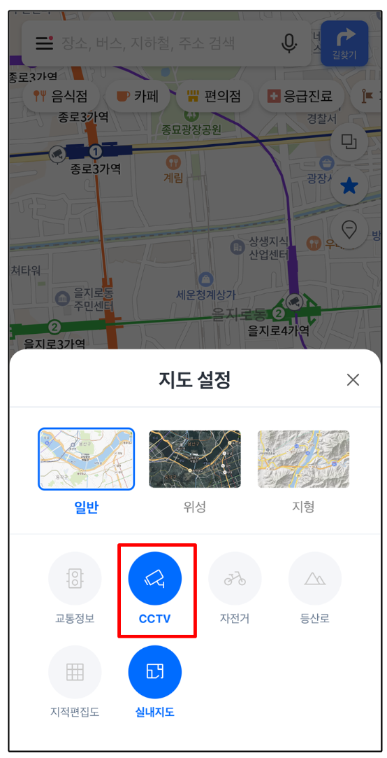 ● 지도설정에서 하단 CCTV를 터치하여 활성화합니다.