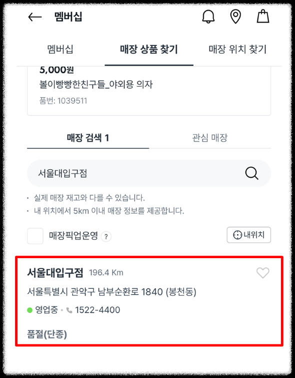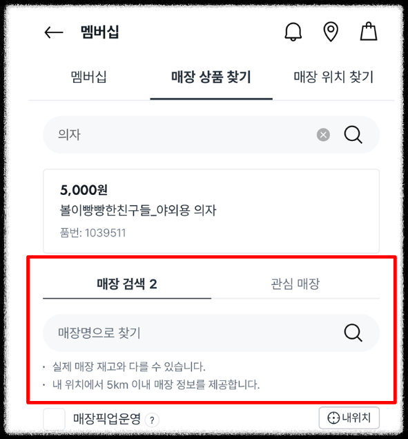 ● 검색한 매장에서 선택한 제품의 재고여부를 확인할 수 있습니다.