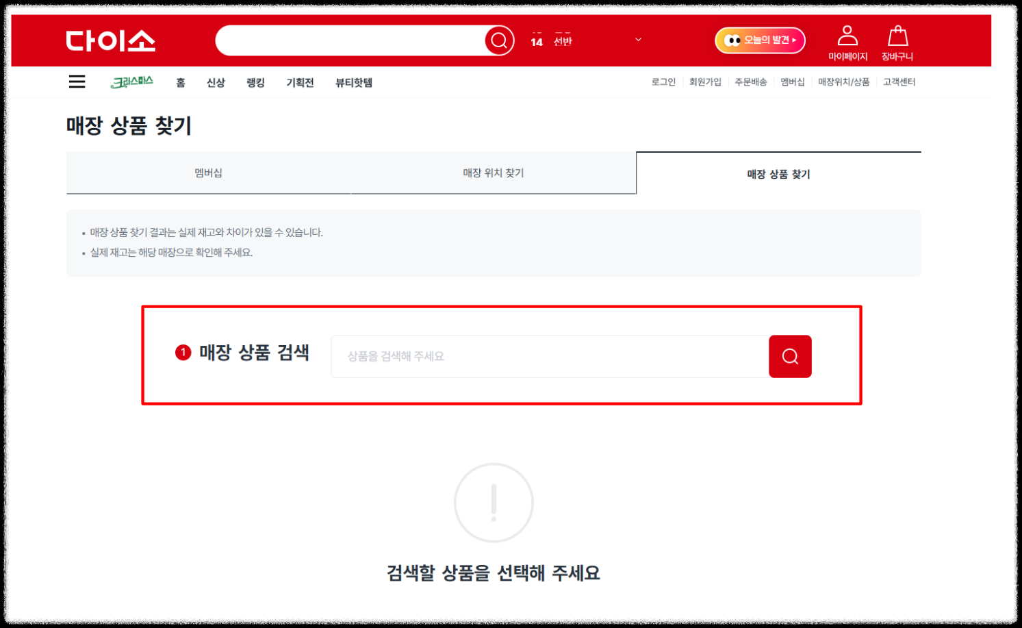 ● 다이소몰 홈페이지 매장 상품 찾기에서 매장 상품 검색란에 원하는 상품을 입력하고 돋보기를 클릭합니다.