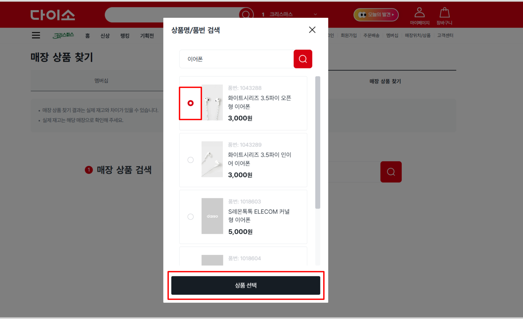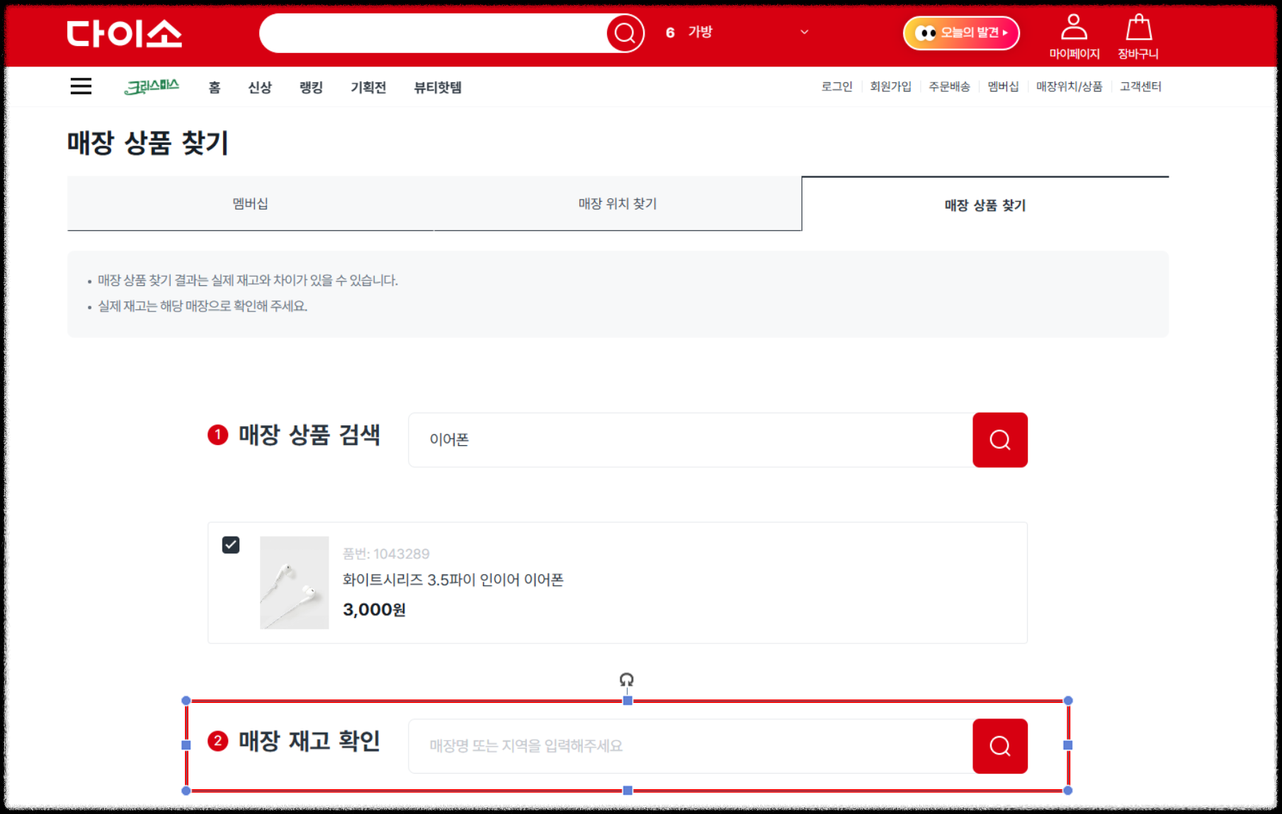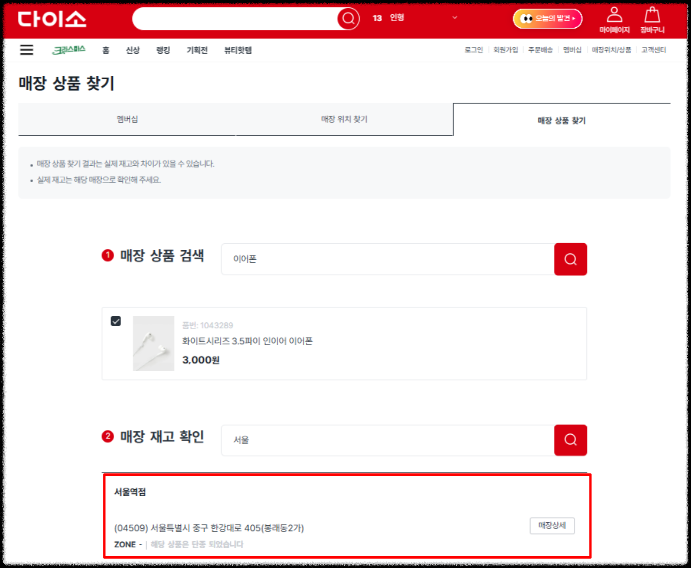 ● 매장 재고 확인란에 매장명 또는 지역을 입력하여 가까운 다이소 매장을 선택합니다.