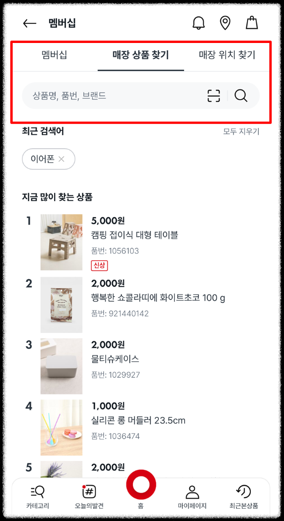 ● 매장 상품 찾기에서 상품명, 품번, 브랜드를 입력 후 돋보기를 터치합니다.
