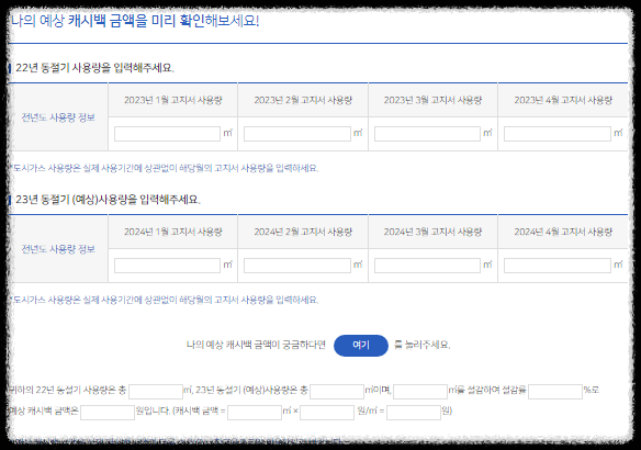도시가스 절약 캐쉬백과 관련하여 K-가스캐시백 홈페이지에서는 캐쉬백 모의계산을 서비스를 제공하고 있습니다. 캐쉬백 모의계산 서비스를 사용하기 위해 본인은 고지서를 확인하여 22년 동절기 가스사용량과 23년 동절기 가스사용량을 파악하셔야 합니다.