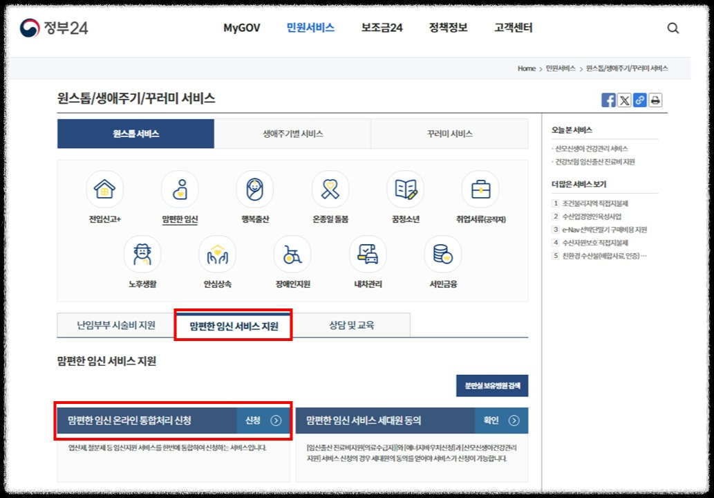 맘편한 임신 원스톱 서비스 신청은 정부 24시에서 신청가능 합니다.