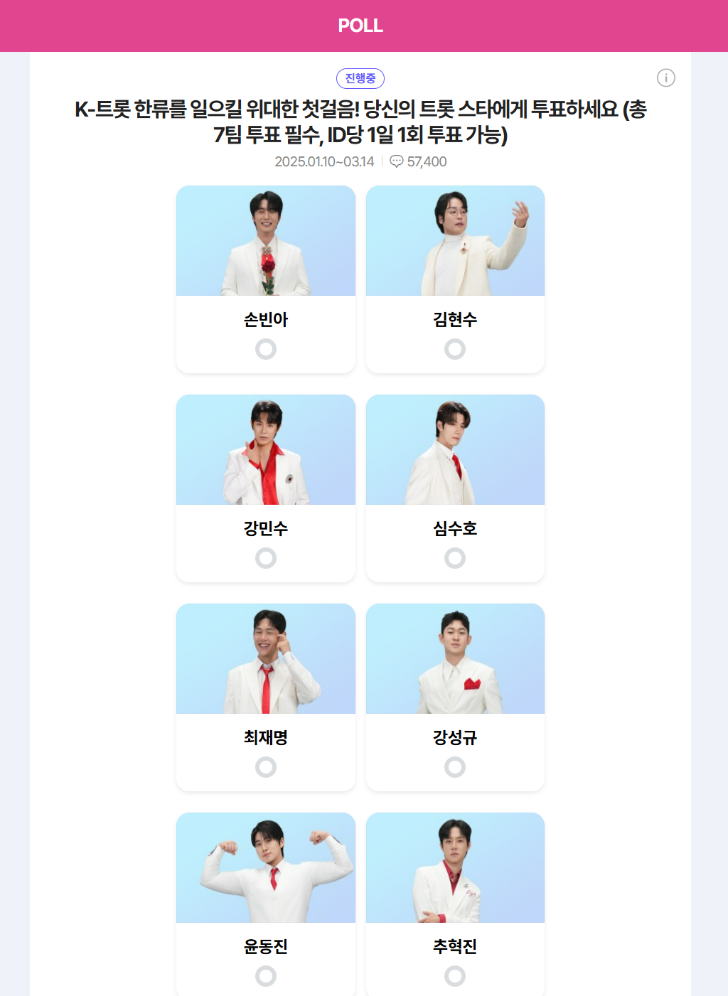 ● 대국민 응원투표는 총 7팀을 필수로 투표해야 하며 하나의 ID당 1일 1회 투표가 가능합니다.