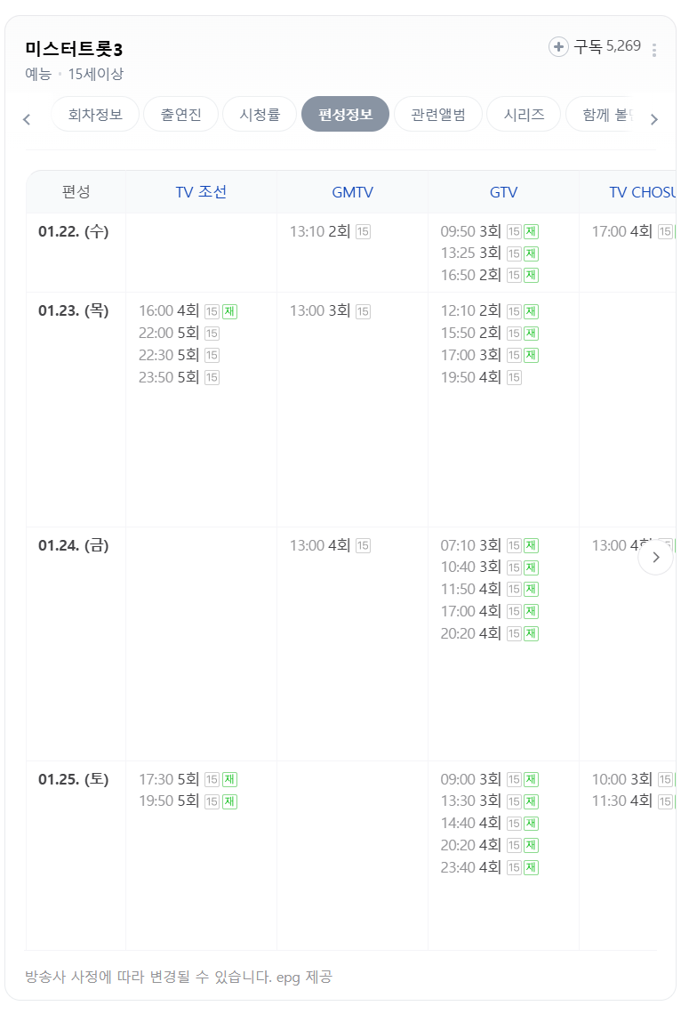 미스터트롯3의 본방송은 매주 목요일 저녁 10시에 방영되며 재방송은 다음날부터 여러 번 편성됩니다.