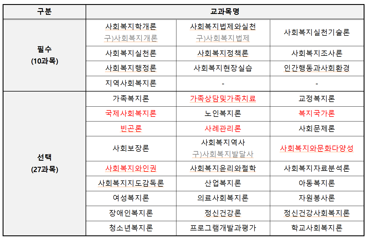 구법 및 신번의 사회복지사 자격증 교과목은 아래의 이미지와 같습니다.