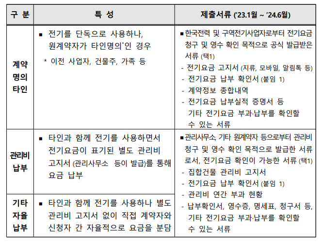 비계약 사용자는 한국전력공사와 계약 관계가 없는 경우로 신청자 정보를 직접 입력해야 하고 아래의 표에 해당하는 전기요금 납부 증빙서류를 제출해야 합니다. 결과적으로 고지서 및 확인서를 통해 확인한 2023년 1월부터 20224년 6월까지의 납부요금에 대해 최대 20만원까지 사업자 대표 계좌로 환급받을 수 있습니다.