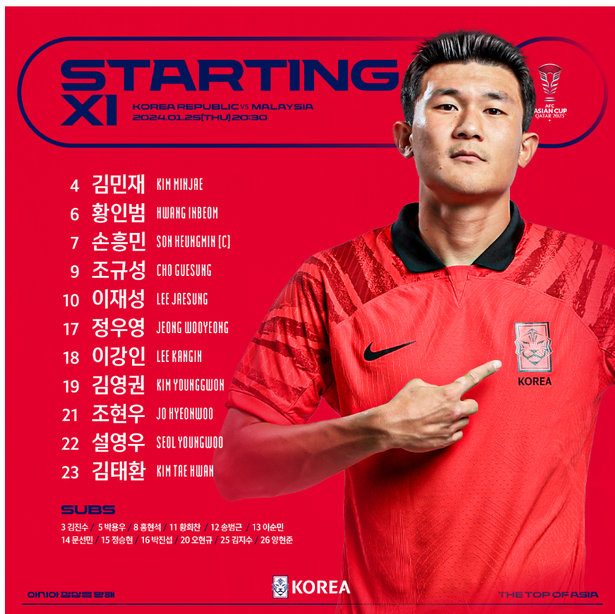 안타깝께도 대한민국 No.1 골키퍼 김승규 선수가 예선 2차전 요르단과의 경기 준비 전 십자인대 파열로 이번 아시안컵 스타팅 멤버에서 제외되어 조현우 선수가 골키퍼 장갑을 이어받았지만 요르단과 말레이시아전에서 보여준 경기력은 빌드업 능력의 부족으로 다소 아쉬운 것이 사실이었습니다. 그러나 고무적인 것은 미드필더 황희찬 선수와 수비수 김진수 선수가 말레이시아전 후반부에 교체투입되어 경기력을 끌어올렸기 때문에 16강전 사우디아라이비아와의 경기에 선발출전할 가능성이 높아졌습니다.