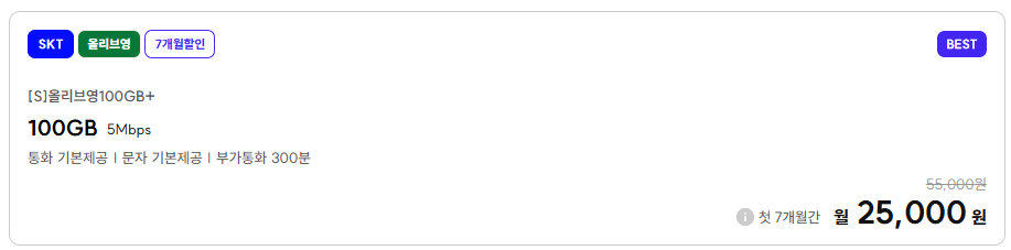 ✔️ 데이터 : 고속 100GB 제공(이후 5Mbps 속도 무제한)