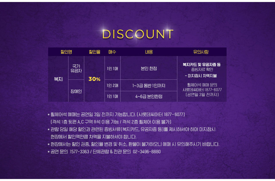 휠체어석은 객석 1층 뒤편 A, C 구역에 R석으로 배정되어 있으며 객석 2층에서는 휠체어 이용 관람이 불가합니다. 휠체어석 문의 및 예매는 샤롯데씨어터 고객센터(☎1877-6077)에 문의하시기 바랍니다.