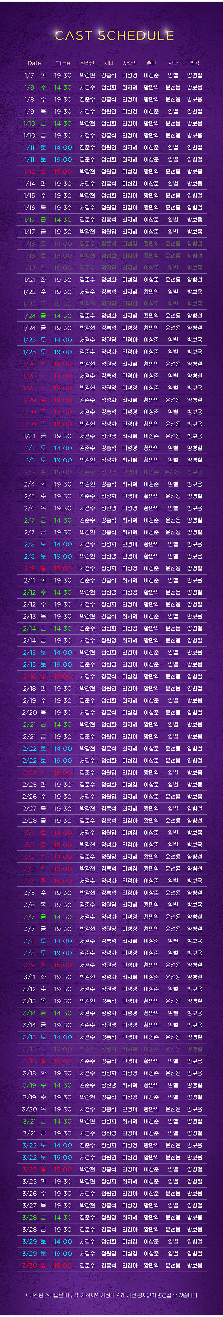 1월 8일, 2월 12일, 3월 19일 수요일에는 2시 30분과 7시 30분 2회 공연