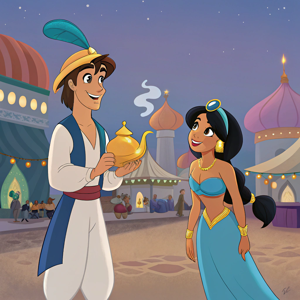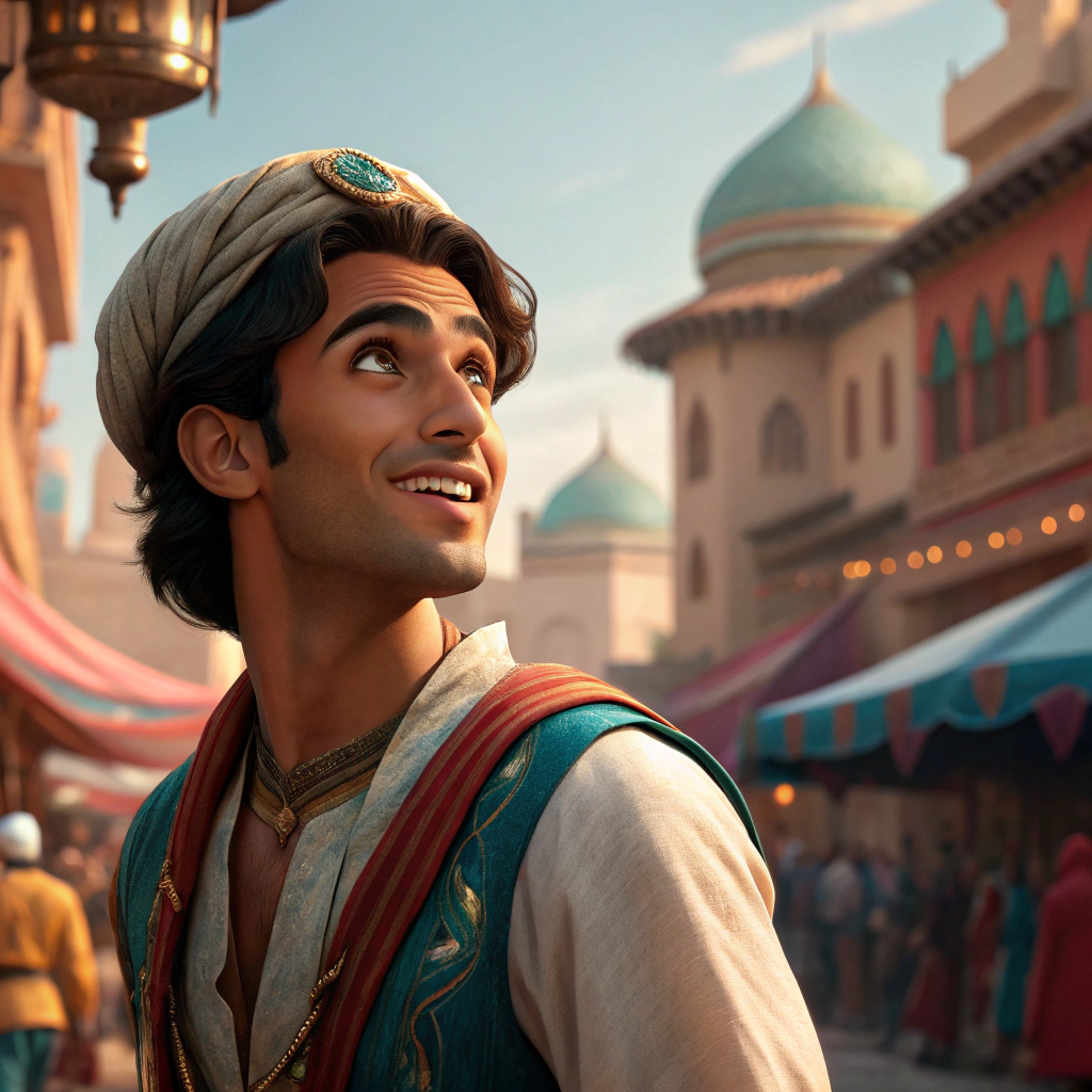 알라딘은 아그라바의 거리에서 살아가는 가난한 청년으로 민첩하고 영리한 성격을 가지고 있으며 자신의 출신에 대한 열등감을 가지고 있습니다. 그러나 그의 마음속에는 고귀한 꿈이 있으며 진정한 사랑을 찾고 자신의 정체성을 발견하고자 하는 욕망을 품고 있습니다. 또한 알라딘은 자스민을 처음 만났을 때 바로 매력을 느끼고 그녀와의 사랑을 위해 여러 가지 어려움을 겪게 됩니다. 마법의 램프를 통해 지니와 친구가 되면서 그의 인생은 큰 전환점을 맞이하게 되며 자신이 진정으로 원하는 것이 무엇인지 깨닫게 되어 외적인 모습이 아닌 내면의 진정성을 강조하여 진정한 용기와 사랑을 통해 사람들을 감동시키는 캐릭터입니다.