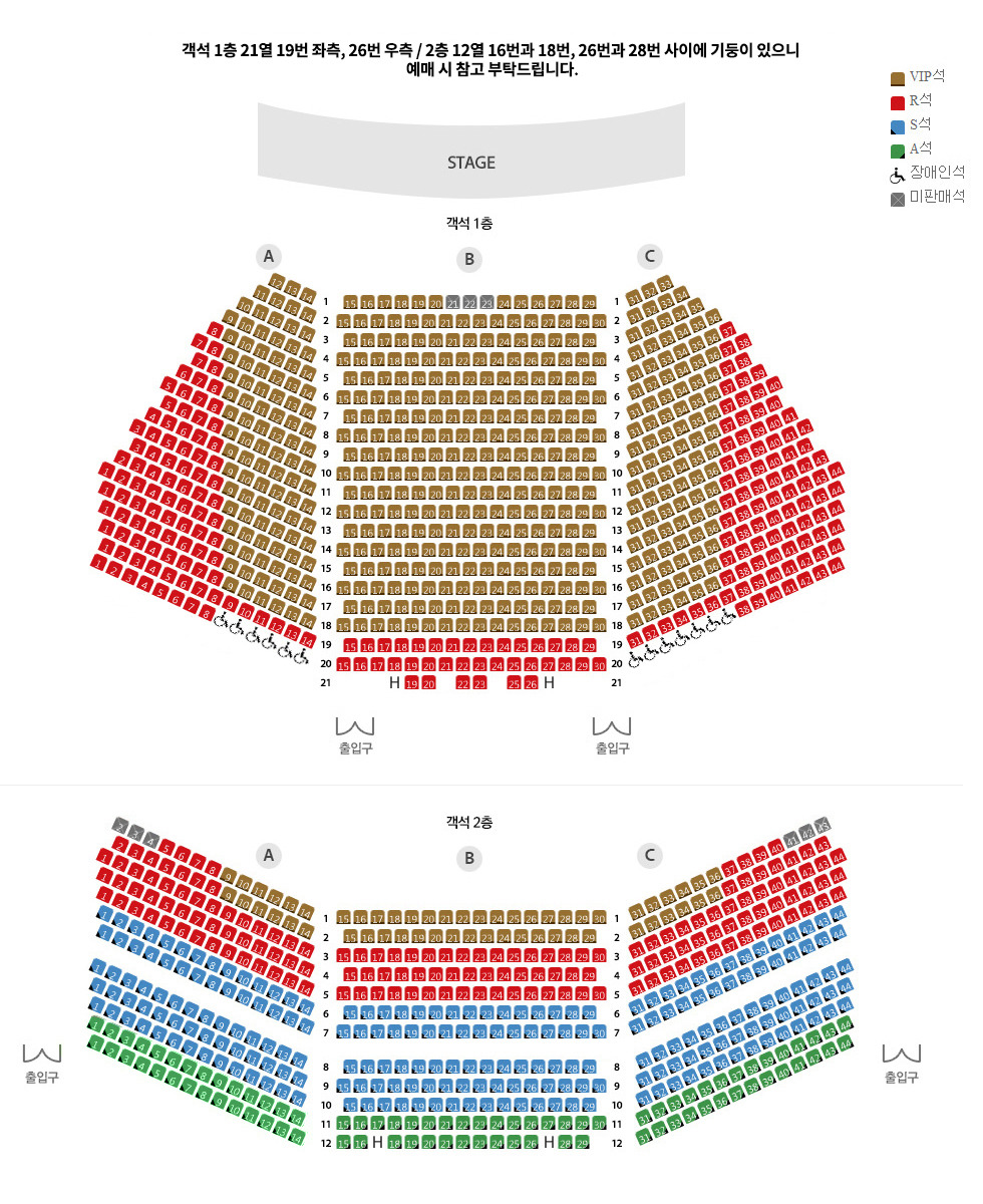 그리고 객석 1층 21열 19번 좌측, 26번 우측과 2층 12열 16번과 18번, 26번과 28번 사이에 기둥이 있으니 예매 시 참고하시기 바라며 고객의 안전을 위하여 2층 1열과 8열 앞쪽 난간 2층 A, B, C 구역 통로 좌석에 안전바가 설치되어 있습니다.