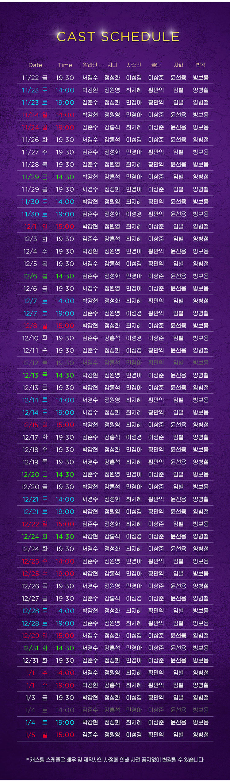 단, 11월 22일 금요일은 오후 7시 30분 1회 공연만 편성되었으며 11월 24일 일요일은 오후 2시와 7시 2회 공연이 예정되어 있습니다.