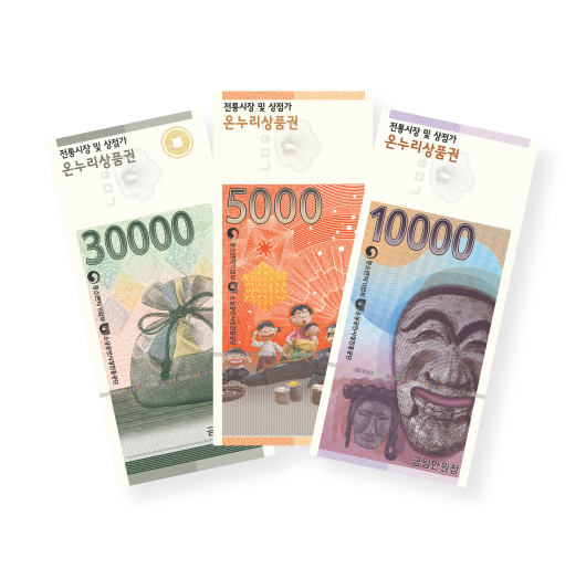 지류 온누리상품권은 전국 16개 기관에서 5천원, 1만원, 3만원권 단위로 구매하여 사용하는 온누리상품권입니다.