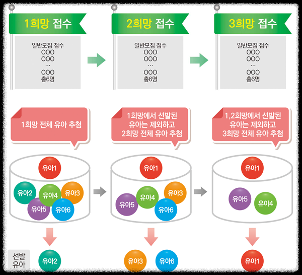 만약 6명의 유아가 A유치원 1희망, B유치원 2희망, C유치원 3희망으로 접수했을 경우 1희망에서 1번 유아가 선발되면 1번 유아의 2희망, 3희망 유치원에서는 1번 유아가 추첨 대상에서 제외되며 1희망에서 선발되지 않은 유아만으로 2순위 추첨을 진행하게 됩니다.