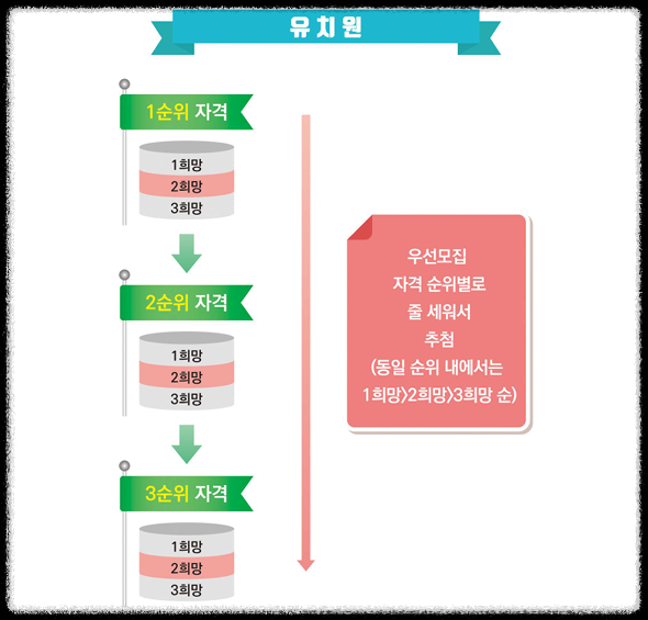 만약 유아가 1희망인 A유치원, 2희망인 B유치원, 3희망인 C유치원에 지원한 경우 각각의 유치원에서 모집요강에 등록한 자격 순위별 모집인원에 따라 1순위, 2순위, 3순위 자격 순으로 선발하며 동일한 우선모집대상 자격 순위 내에서는 1희망, 2희망, 3희망 순으로 순위별 모집인원이 채워질 때 까지 선발하게 됩니다.