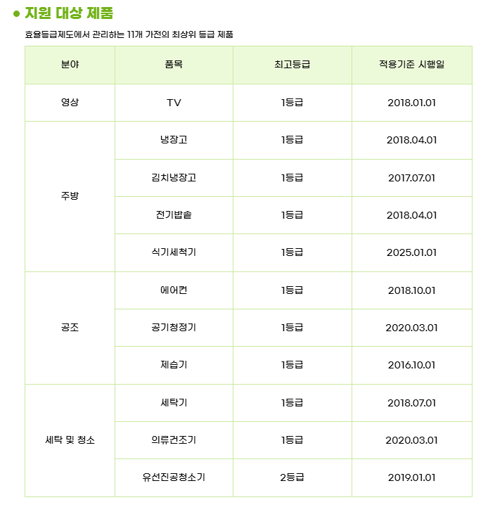 각 품목은 반드시 한국에너지공단 효율등급라벨이 부착되어 있어야 하며 구매 전 해당 모델이 환급 대상 목록에 포함되어 있는지 확인하는 것이 중요합니다.