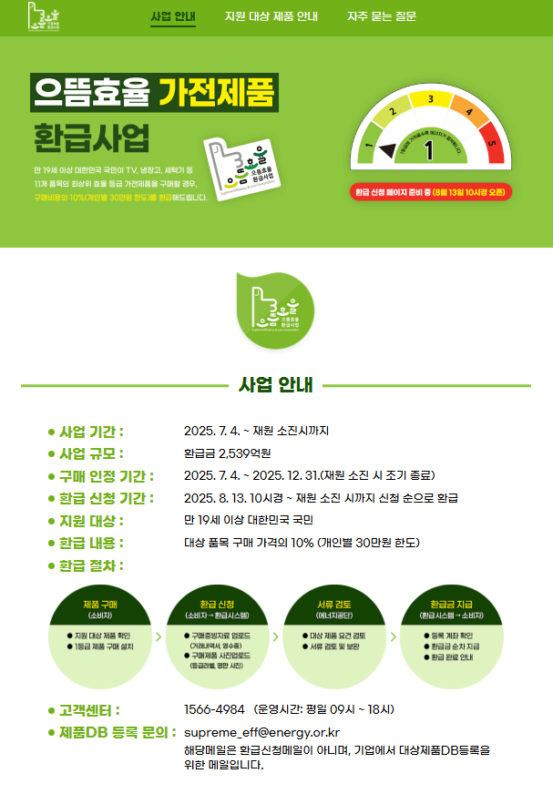 2025년 으뜸효율 가전제품 환급사업은 오는 7월 4일부터 예산이 소진될 때까지 진행되며 올해 사업 규모는 총 2,539억원으로 한정된 예산 내에서 선착순으로 환급이 이루어집니다.