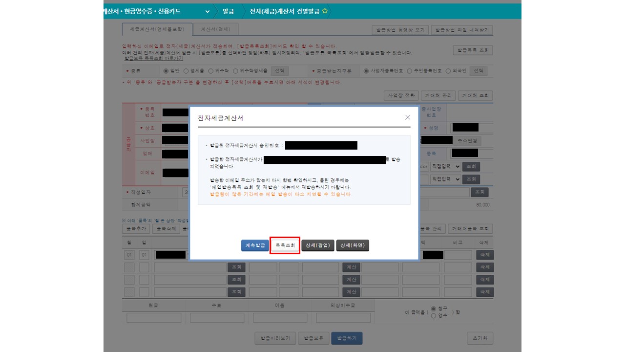 10. 발급된 전자세금계산서 승인번호, 발송된 이메일 주소 등이 보이는 팝업창이 나타나면 전자세금계산서 발행은 완료되었습니다. 여기서 전자세금계산서가 확실히 발행되었는지 확인하기 위해 목록조회를 클릭합니다.