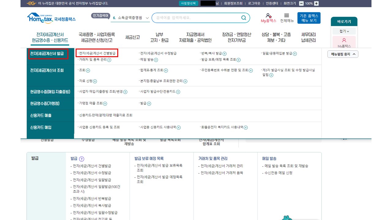6. 사업장 선택 후 전자(세금)계산서 발급 → 전자(세금)계산서 건별발급을 클릭합니다.