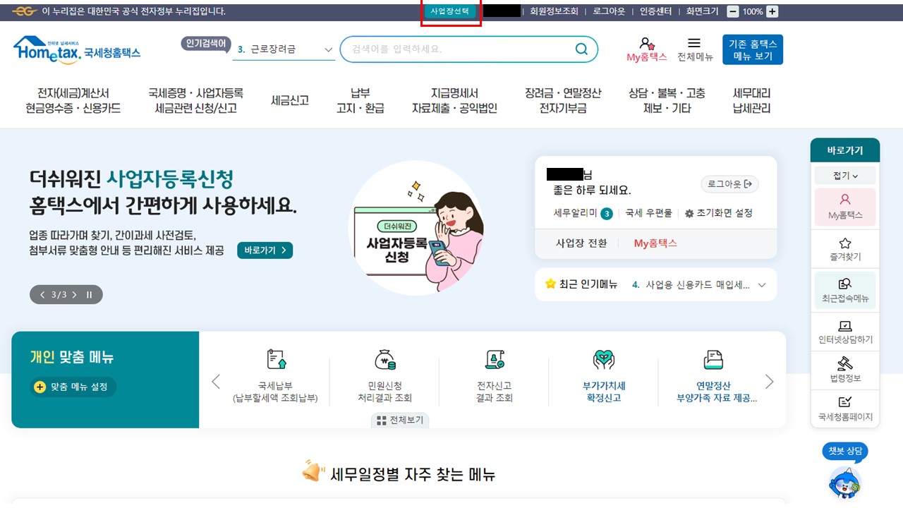 3. 아이디 로그인을 완료하였다면 홈페이지 상단에 사업장 선택을 클릭합니다.