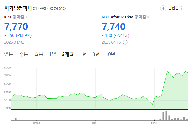 2025년 4월 7일 아가방컴퍼니 주가는 이날 오후 3시 기준으로 20.18% 상승하여 거래되었습니다.