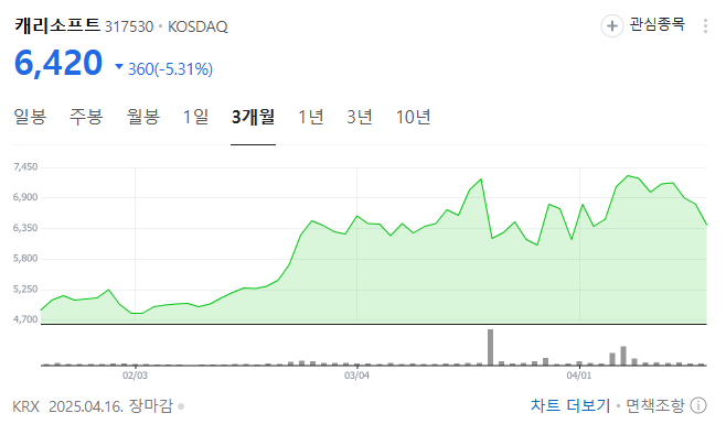 2025년 4월 7일 출산장려 관련주 캐리소프트는 4.93% 상승하여 거래되었습니다.