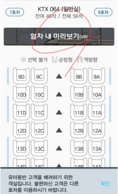 코레일톡으로 예약을 하게 되면 KTX 좌석 배치를 VR로 미리 확인하실 수 있습니다. 이 기능은 서비스 된지 얼마 안되었는데 좌석 콘센트 위치나 창가 자리를 확인할 때 굉장히 유용할 것으로 생각합니다.