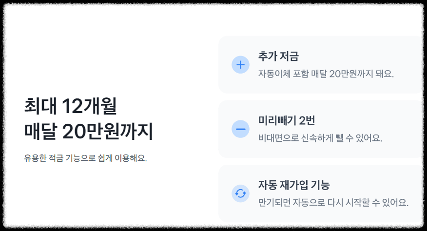 우대조건의 경우 다른 적금상품과 달리 12개월간 빠지지 않고 일정금액을 자동이체 한다면 무조건 적용되며 재가입도 가능하니 굉장히 매력있는 상품으로 생각됩니다. 따라서 토스뱅크 아이적금의 기본정보 및 금리정보, 신청방법등에 대하여 자세히 소개해 드리겠습니다.