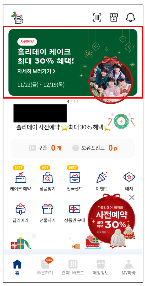 ● 파바앱 메인 상단의 홀리데이 케이크 사전예약을 클릭합니다.