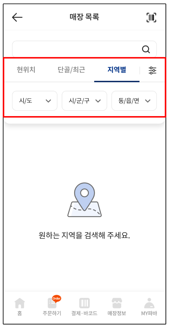 ● 매장목록에서 현위치, 단골/최근, 지역별 중 하나를 선택하여 매장을 검색합니다.