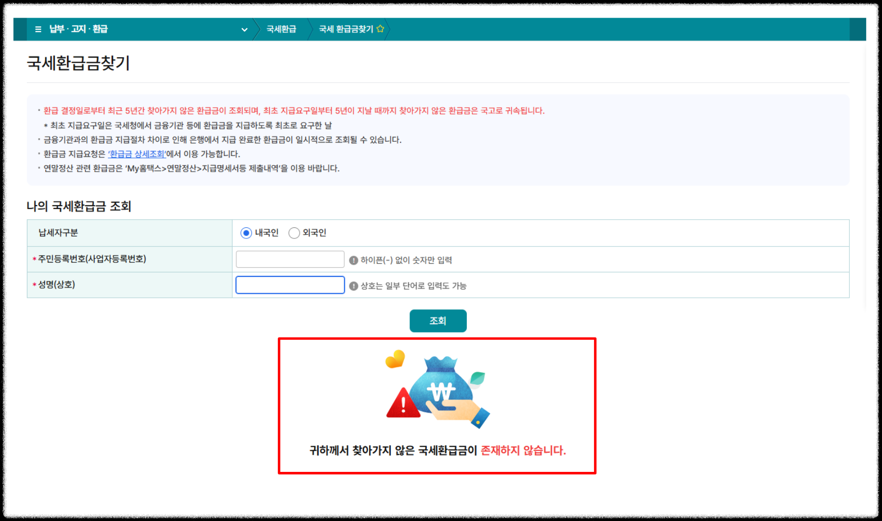 ● 개인정보를 입력하면 국세환급금 존재 여부를 확인할 수 있습니다.
