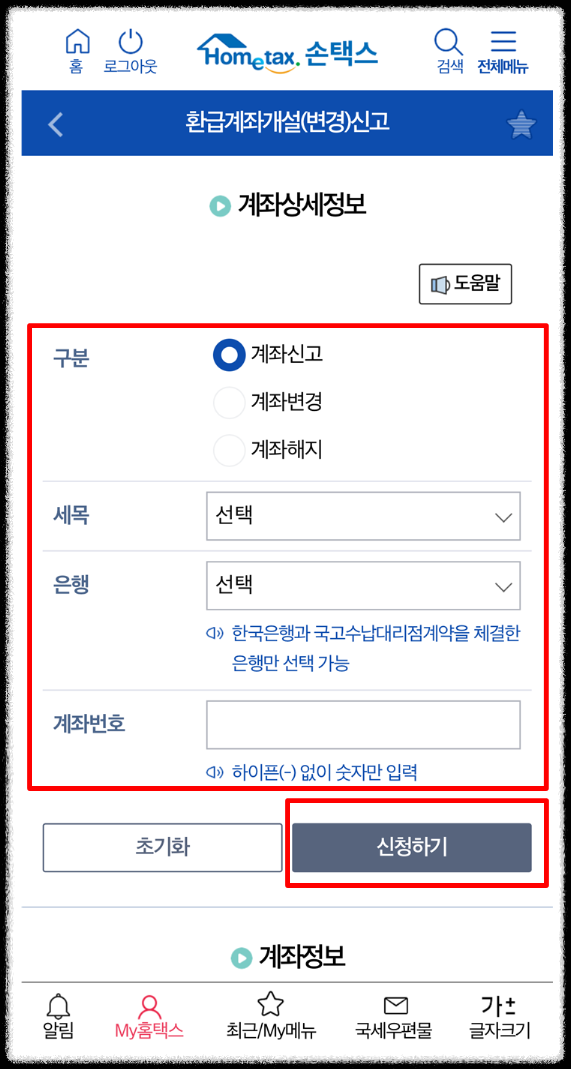 ● 계좌상세정보에서 구분은 계좌신고 선택, 세목, 은행, 계좌번호 입력 후 신청하기를 터치합니다.