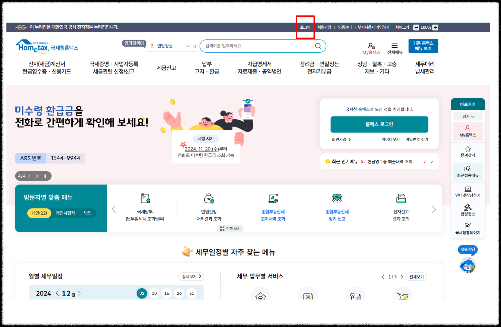 ● 홈택스 웹사이트 상단의 로그인을 클릭합니다.