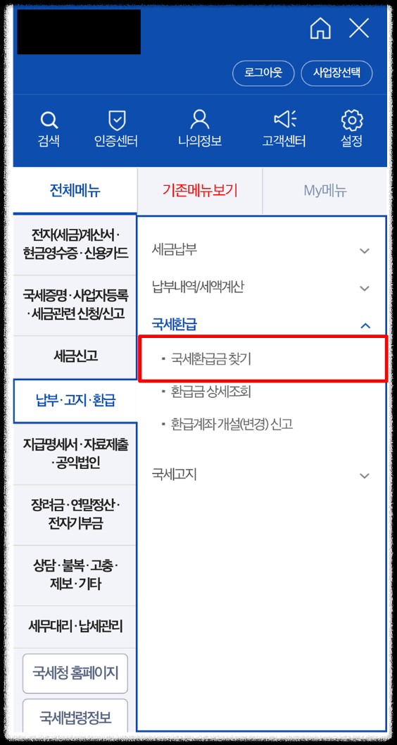 ● 전체메뉴 보기에서 납부 / 고지 / 환급 → 국세 환급금찾기를 클릭합니다.