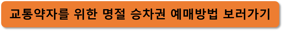 □ 장애인, 상이유공자는 명절 예매 전용 홈페이지에서 반드시 사전 등록하여야 하며(경로는 자동등록) 여행 정보를 미리 저장하고 예매 당일 불러오는 기능 이용 가능
