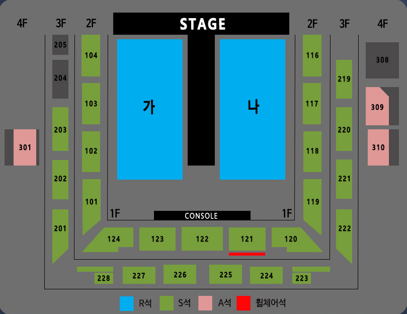 그리고 휠체어석은 121 구역의 빨간색으로 표시된 좌석입니다.