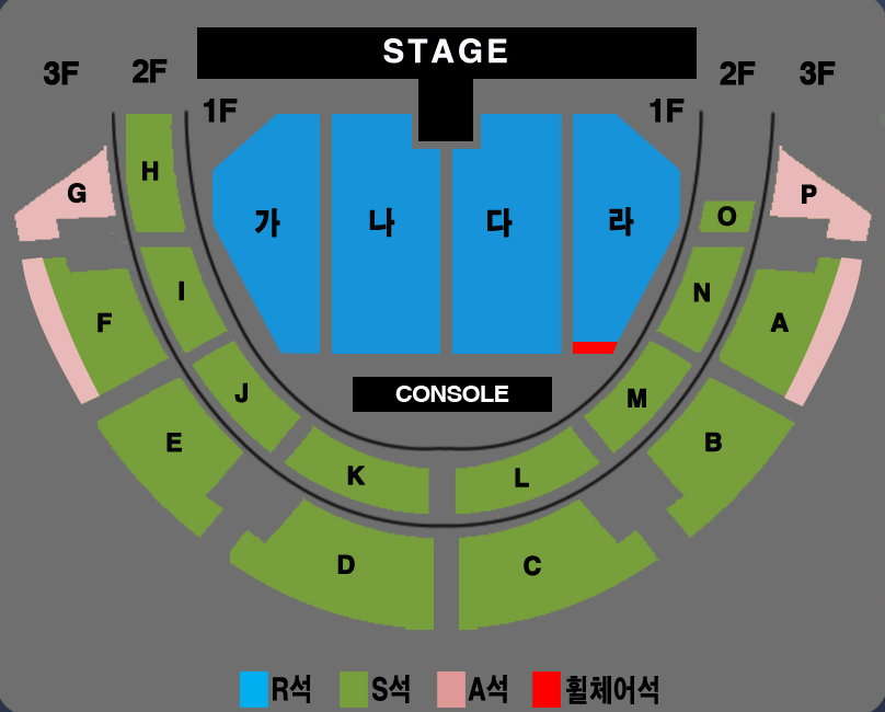 2024 나훈아 전주 콘서트가 열리는 전북대학교 전주실내체육관의 1층 가부터 라구역은 단차가 없는 평지좌석이며 보조의자가 설치될 예정이고 휠체어석은 라구역의 빨간색으로 표시된 좌석입니다.
