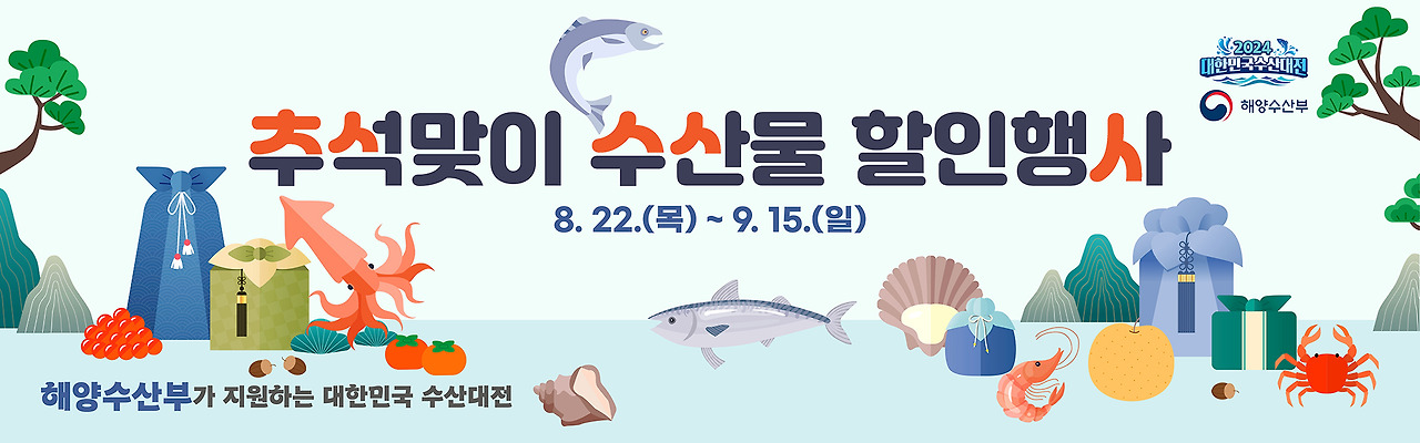 2024 대한민국 수산대전 추석맞이 수산물 할인행사는 2024년 8월 22일 목요일부터 9월 15일 일요일까지 주요 온라인 및 오프라인, 전통시장에서 개최합니다.