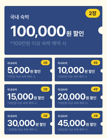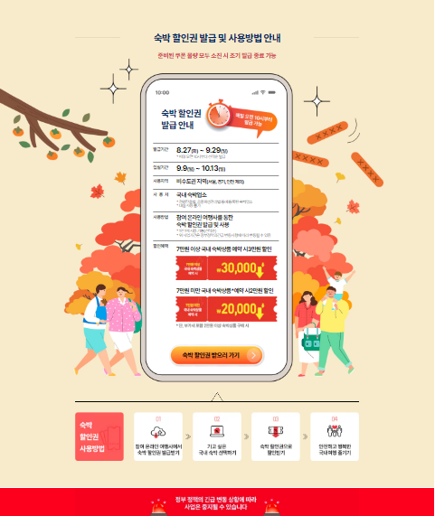 숙박 할인권은 선착순으로 1인 1매만 사용이 가능하며 사업기간은 정부정책의 긴급한 변동사항에 따라 변동될 수 있습니다.
