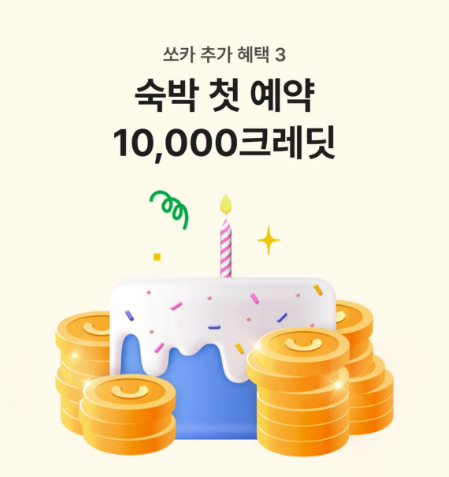 세번째 쏘카의 한정 혜택은 숙박세일 페스타 기간 안에 첫 숙박을 예약하는 경우 현금처럼 사용이 가능한 10,000 크레딧을 제공합니다. 혜택 기간은 2024년 8월 20일 화요일부터 10월 13일 일요일까지이며 크레딧의 지급 시점은 2024년 10월 14일 월요일에 일괄로 지급됩니다. 그리고 크레딧 지급 여부 확인 방법은 쏘카 앱 우측 상단 메뉴에서 확인이 가능합니다.