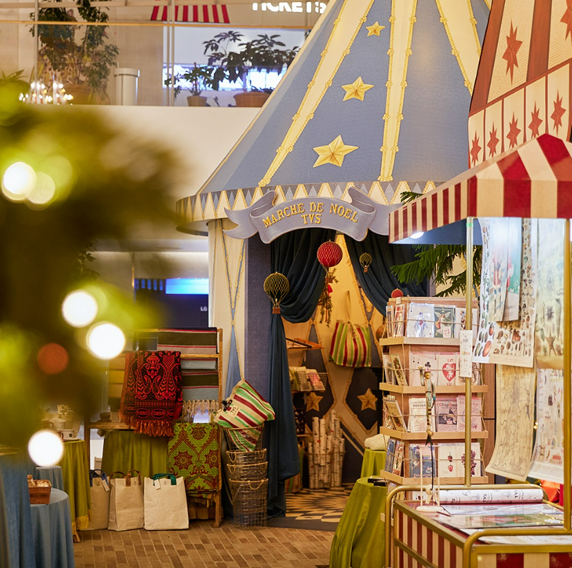 행사장 중앙에는 해리베어 인형, 머그잔, 트레이 등을 판매하는 상점이 있고 장난감 병정과 오너먼트 등 다양한 크리스마스 아이템을 판매하고 있습니다.