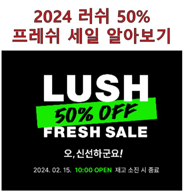 영국의 유명 화장품 브랜드 러쉬는 일년에 딱 한번 시행하는 러쉬 프레쉬 행사를 2024년 2월 15일 10시부터 시작합니다. 배쓰 밤, 샤워 젤리, 고체 샴푸 등 기발하고 혁신적인 제품을 선보이며 국내에도 많은 팬을 보유하고 있는 화장품 브랜드 러쉬가 최대 50% 할인 행사를 시작한다면 빠른 기간안에 인기있는 제품이 소진될 것으로 판단합니다.