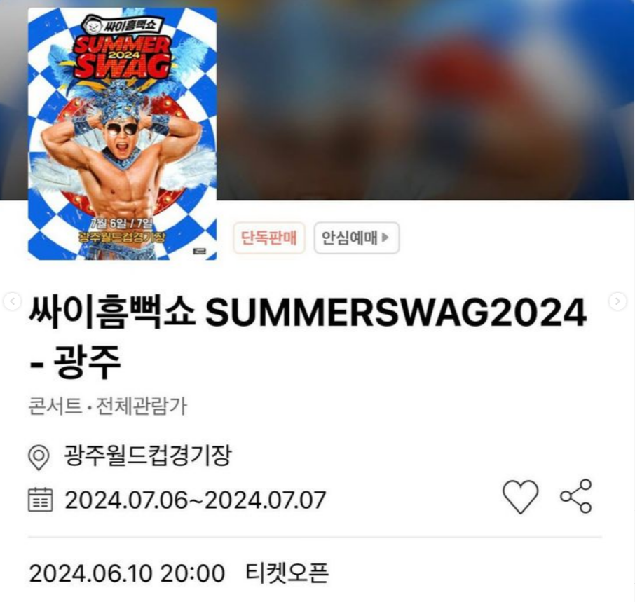 싸이 흠뻑쇼 광주 예매 관련 일반예매 기간은 2024년 6월 10일 월요일 오후 8시부터 가능하며 지역별로 1인당 4매까지 예매가 가능하지만 선예매로 4장 이상을 예매한 경우에는 일반 예매가 불가능합니다.