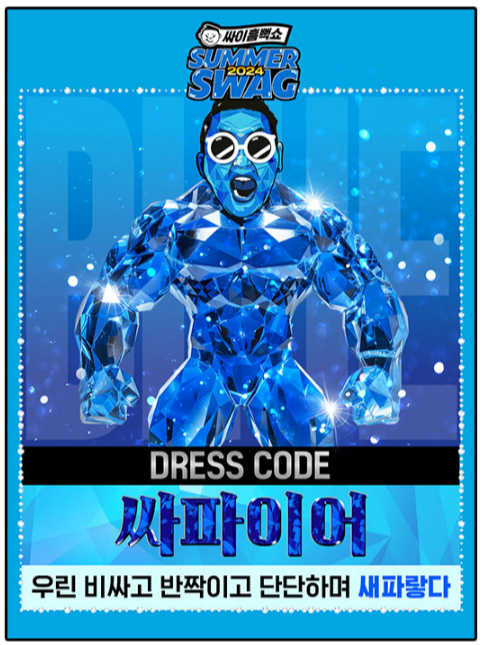 싸이 흠뻑쇼 부산 콘서트에서는 물에 흠뻑 맞는 것을 대비하여 주최 측에서 물에 옷이 젖는 것을 막아주는 파란 우비와 소지품을 보관할 수 있는 파란 비닐 백팩을 제공하며 드레스코드는 블루계열의 의류를 준비하시기 바랍니다.